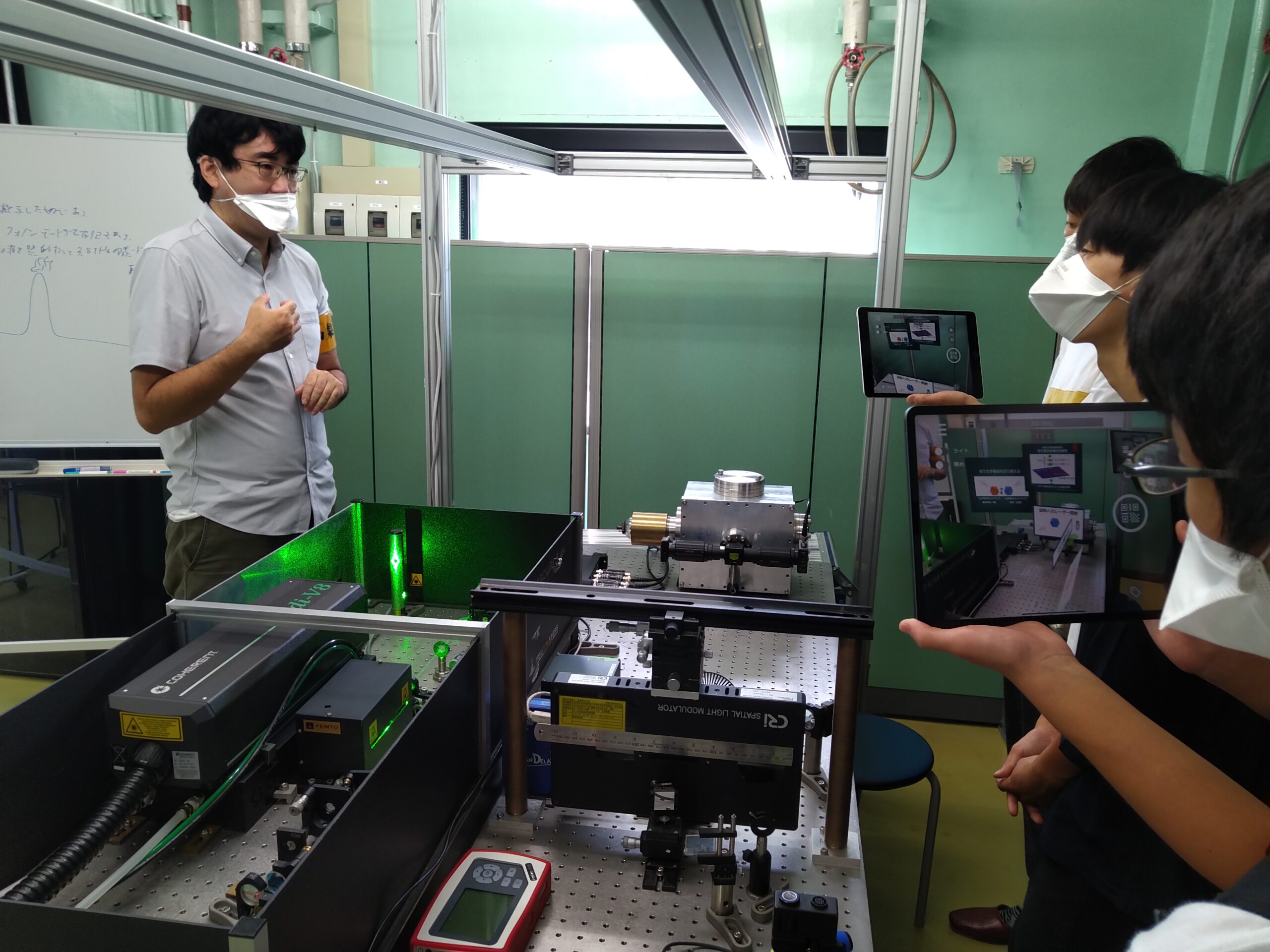 一部のラボツアーでもDiveシステムを使用しました。実際に研究室に置かれている最先端の実験装置を見せながら、ここでどんな研究がおこなわれているのかを説明しました。その際、Diveをインストールしたスマートフォンやタブレットをかざすと、実験装置上に、実験器具の説明やレーザ光の伝搬の様子が浮かび上がるようにしました。また、この研究の応用例などの説明文なども表示されます。ARを利用することによって、実際の光学系に仮想の光の映像などを重ねて表示することで、直感的にわかりやすく説明できました。